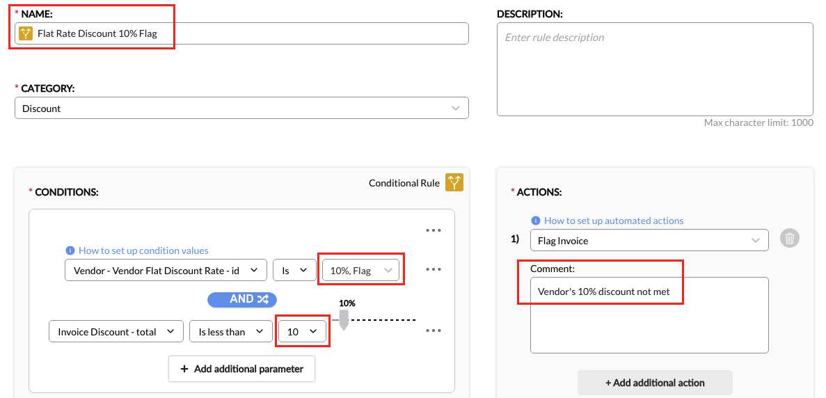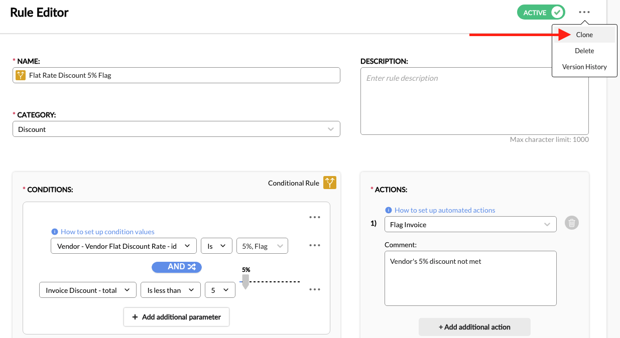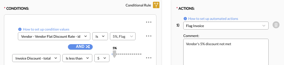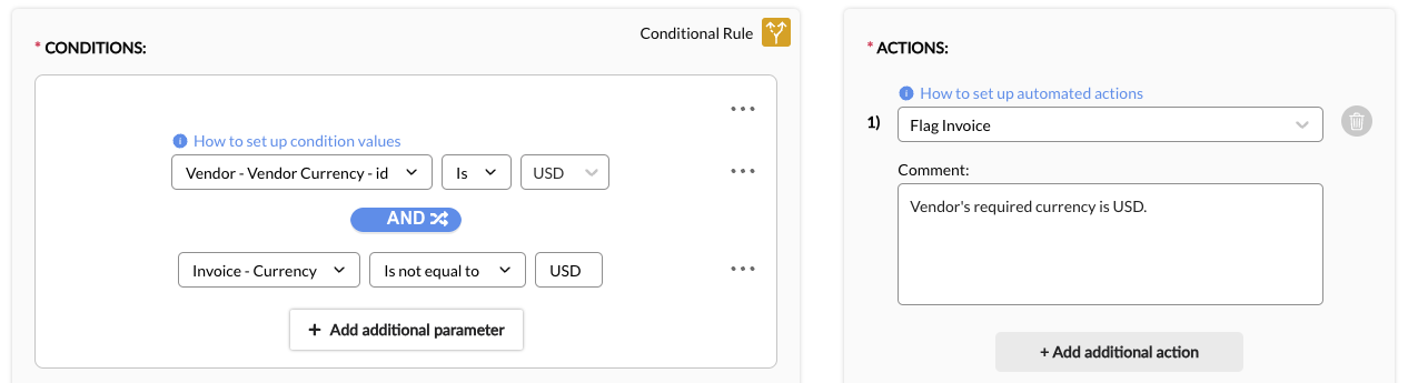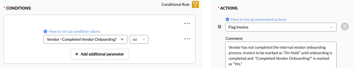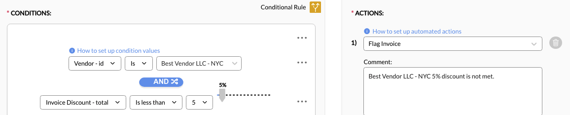 3. Add a Condition. Conditions are statements that set which criteria must be met for the action to trigger. A rule can have one or multiple conditions depending on how broad or narrow the criteria. For example, a simple rule can have a condition that looks for and flags line items with specific expense codes. A more complex rule, on the other hand, can have multiple conditions to look for and adjust line items with specific expense codes that exceed a threshold.