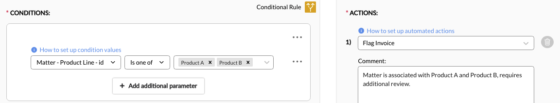 For example, if the practice area on an invoice is Litigation and the invoice is over $10,000, then we will flag an invoice for review.