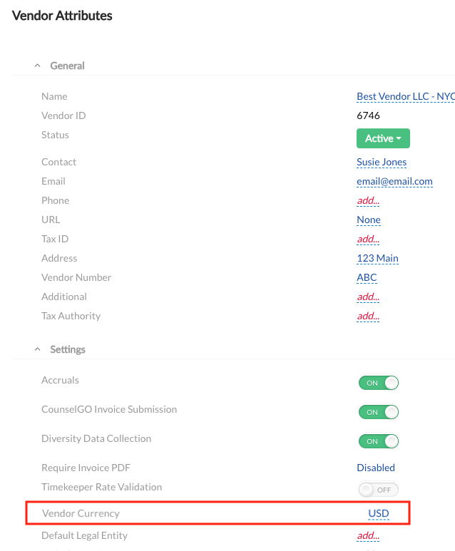 Configuration Step 2: Assign vendor currencies to vendors. Locate the vendors' profile and assign the currency using the newly created custom attribute. Note: Unity's bulk functionality can also be utilized.